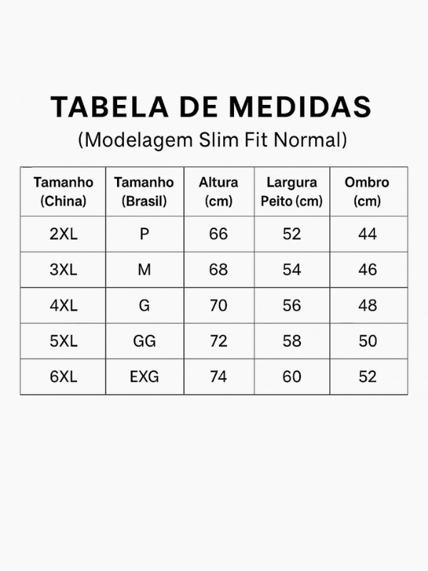 Tabela de Medidas (Modelagem Slim Fit – Tamanhos Reais)